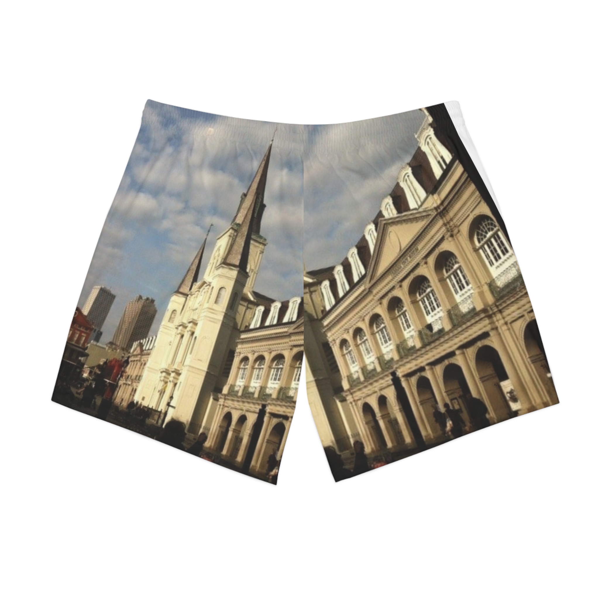 These lightweight beach shorts carry the warm, sunlit streets of a historic city right into your summer rotation. The all-over photographic print shows a cathedral spire and classical façades under a soft blue sky — a quiet, cultured scene that reads like a travel memory. Wear them on long walks along the boardwalk, at seaside cafés, or lounging after a dip. The relaxed cut and inner mesh brief keep movement easy and comfortable. Subtle details — like side-entry pockets and an internal white drawstring — make these shorts feel thoughtfully finished, while the soft polyester-spandex knit drapes easily and dries fast. If you’re someone who collects places and moments, these shorts let a favorite view travel with you.